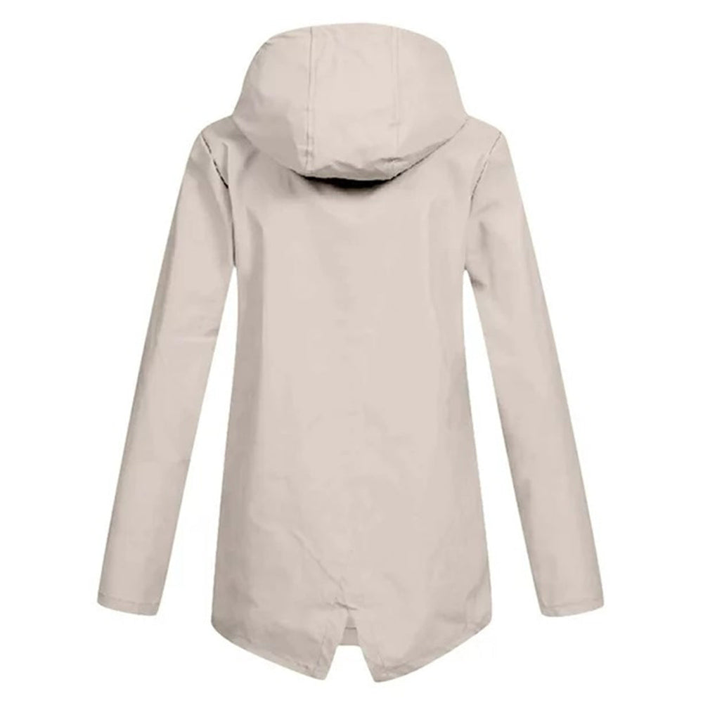 HVORFOR VÆLGE Lang dameregnjakke med hætte og knaplukning